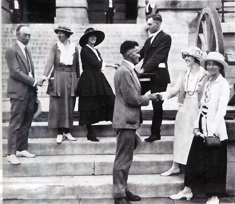 National Woman’s Party members thanking legislators outside the State Capitol today after the vote. Harry Burn is in the dark suit just right of center, in the background, shaking hands with Anita Pollitzer. On the far left is Banks Turner, shaking hands with Catherine Flanagan. In front are Thomas Simpson, Betty Gram and Sue White.