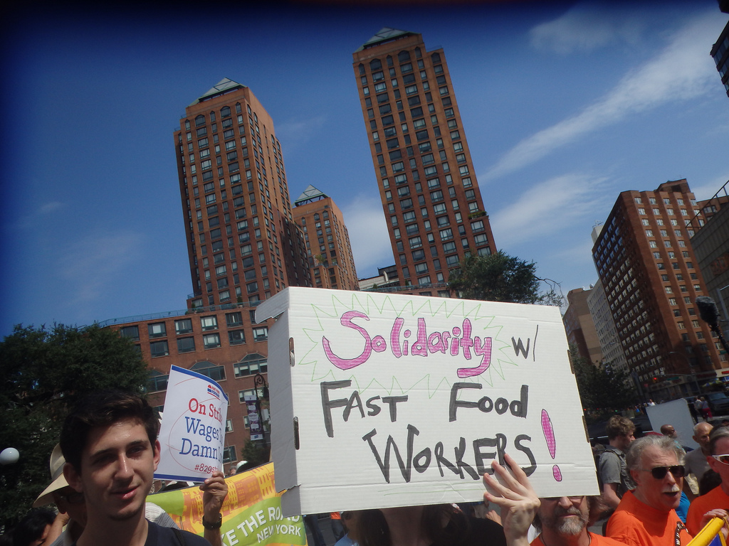 Fast food workers across the US have been striking and protesting for higher wages and more labor protections for almost a year now – changes that would particularly help women and people of color. Seventy-three percent of all front-line fast food workers are women, and 43 percent are black or Latino. Fifty-two percent of fast food workers have to rely on public assistance because their wages are too low to survive on. But as Michelle Chen reports in the Fall 2013 issue of Ms., the National Restaurant Association has opposed increases in wages, and the industry “lobbies fiercely against local, state and national minimum-wage legislation, claiming the pay boost would cause job losses and hurt businesses. Meanwhile, the CEO of McDonald’s raked in about $13.8 million in fiscal 2012, an estimated 737 times what the average fast-food worker earned.”