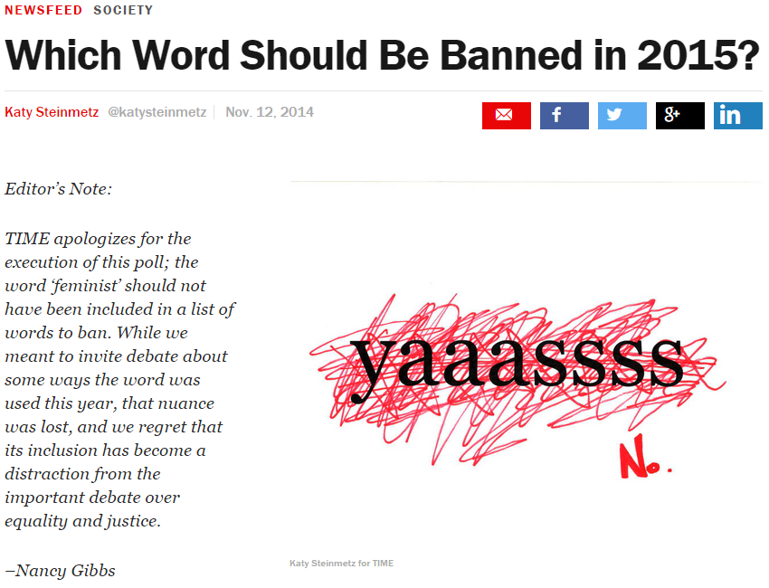 Time Magazine is facing backlash after a poll they released last week listing the work “feminist” alongside popular slang terms on a list of words that should be “banned” in 2015.