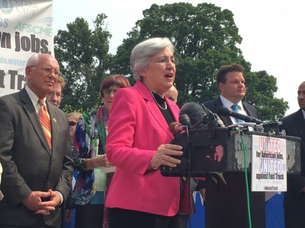 Dozens of activists, leaders, and members of Congress joined Representative Rosa DeLauro (D-CT) and Feminist Majority President Eleanor Smeal this morning to speak out against the Trans-Pacific Partnership (TPP).